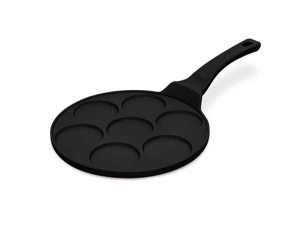 - 7-dierkový dizajn: Panvica s rozmermi Ø26 x 1,3 cm má sedem dier, čo umožňuje piecť viacero palaciniek súčasne. Je ideálna na rýchlejšiu a pohodlnejšiu prípravu raňajok.